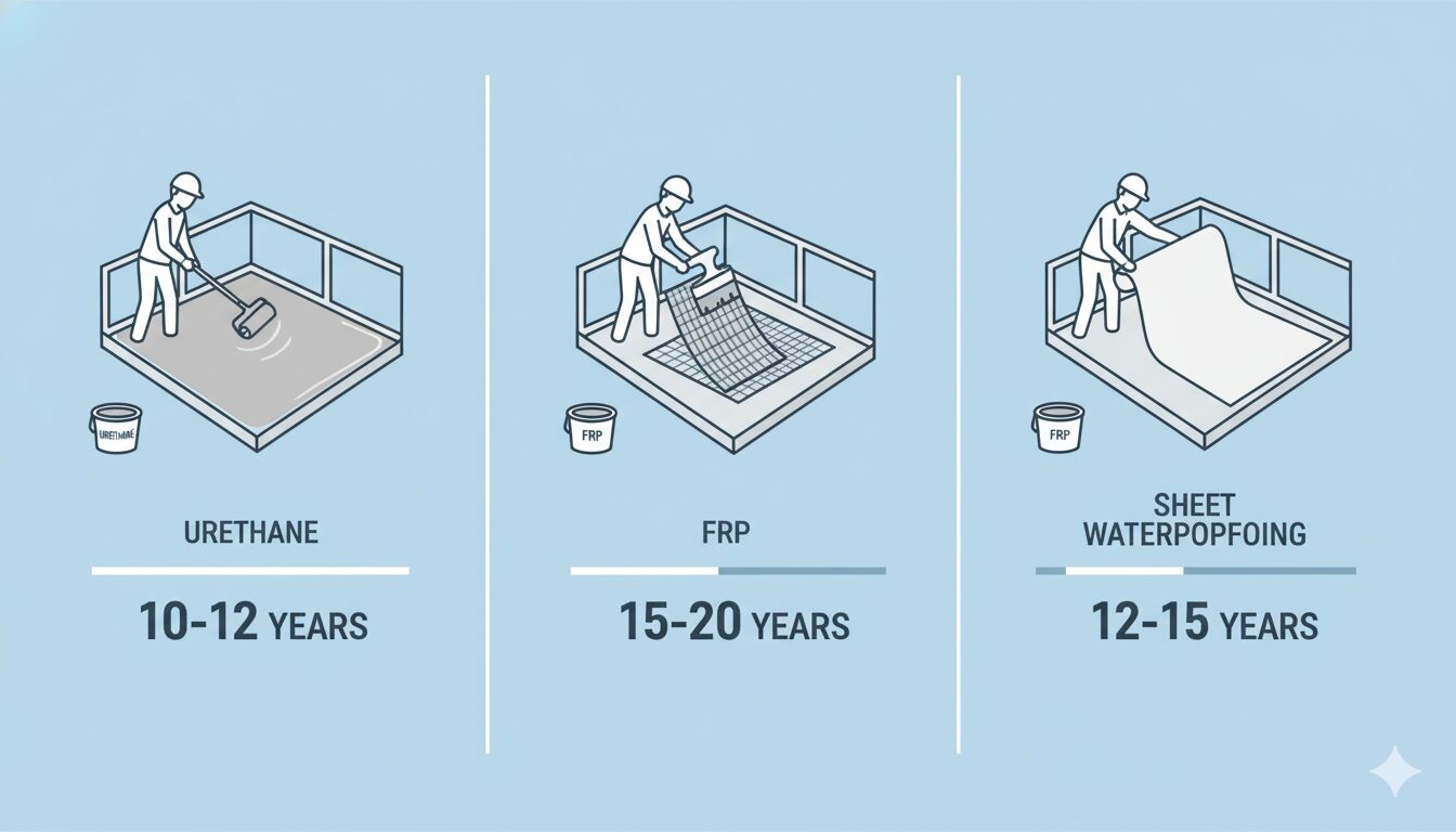 ベランダ防水にはいくつかの工法があり、それぞれ耐用年数や特徴、費用が異なります。
