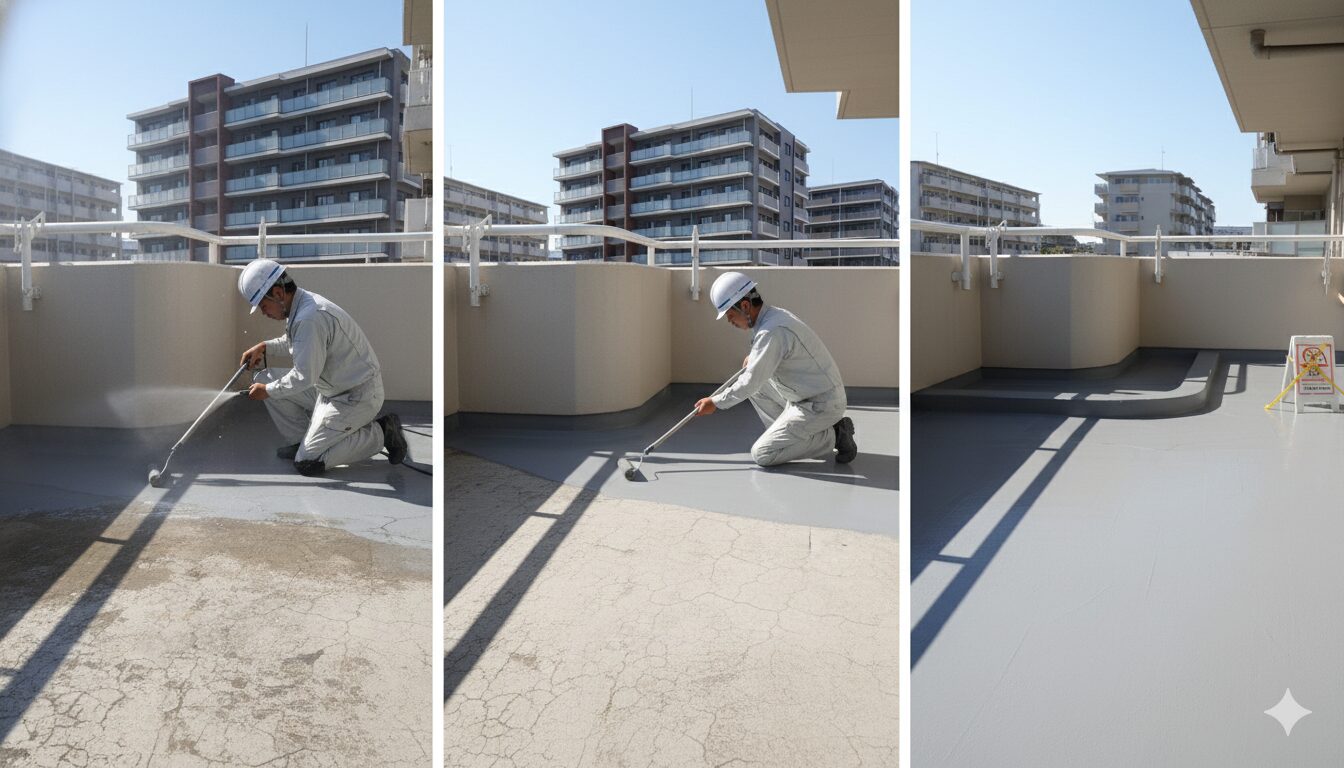 液体状のウレタン樹脂をローラーやコテで塗布するため、複雑な形状のベランダや障害物が多い場所でも、継ぎ目のないシームレスな防水層を形成できるのが最大の強みです。