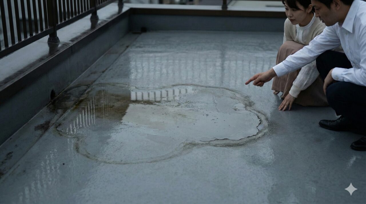 防水工事後に水たまりが見えると、「これって大丈夫?」と不安になる一方で、「そのうち乾くだろう」と放置してしまう方も少なくありません。