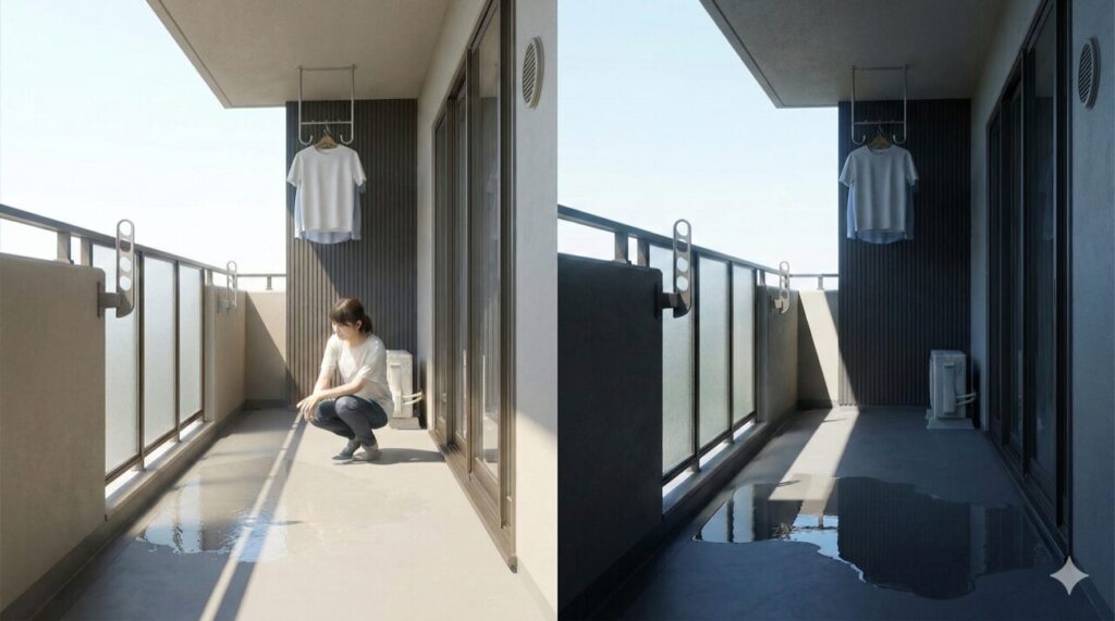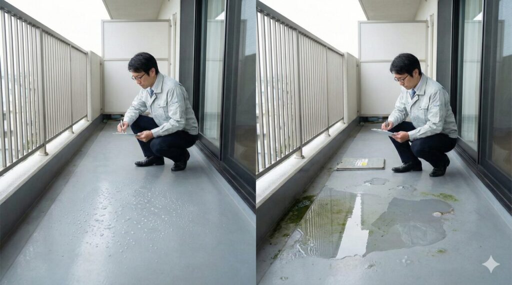 防水工事後の水たまりは、一見すると同じ「水が残っている状態」に見えても、原因がまったく違うことがあります。