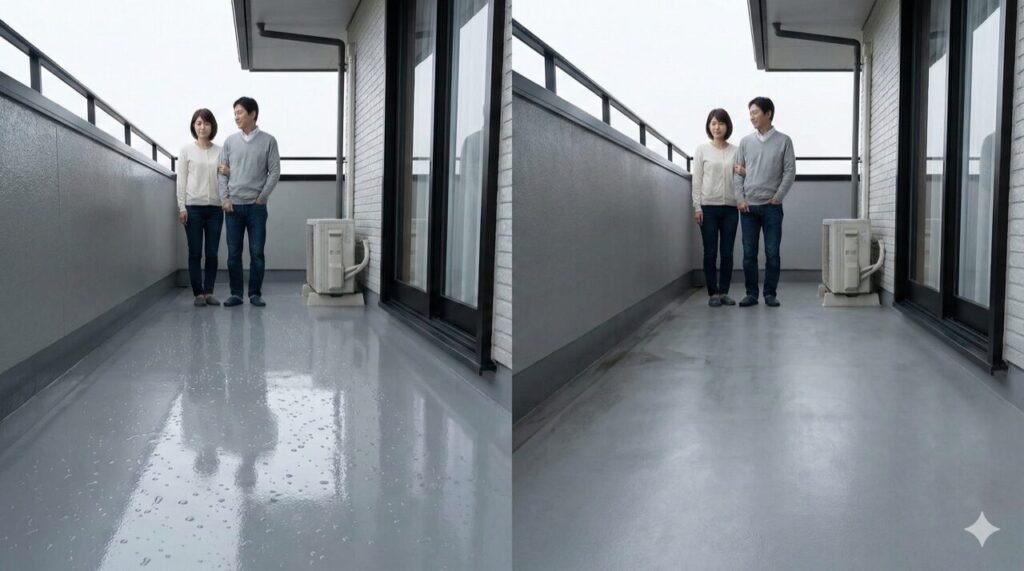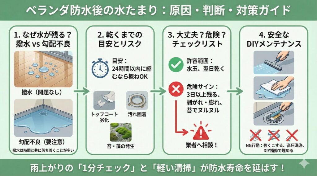 水が長く残く状態が続く場合は、表面(トップコート)だけでなく防水層の状態も早めに点検するのが安心です。