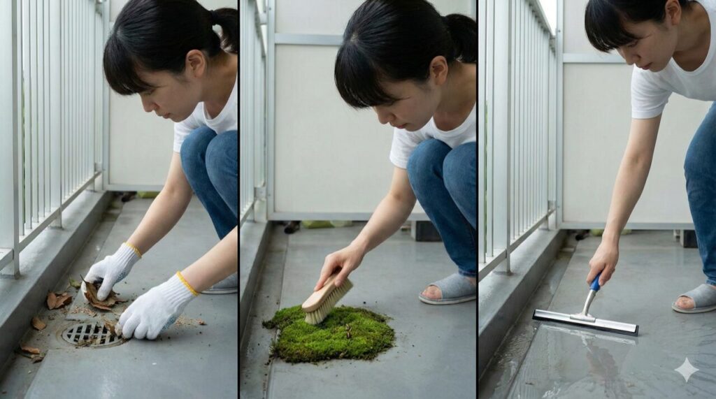 水があっても、床がきれいで乾きやすい状態なら定着しにくい一方、汚れが溜まると水が引きにくくなり、湿気がこもって苔が生えやすくなります。つまり対策は「薬剤」より先に、乾きやすい環境に戻すことが基本になります。