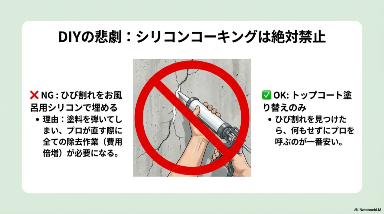 シリコンの上には塗装(防水材)が一切密着しません(弾いてしまいます)。そのため、後になってプロに頼んだ時に、埋めたシリコンを完全に削り取る除去作業が必要になり、工事費が倍増してしまうのです。「ひび割れを見つけたら、何もせずにそのままプロを呼ぶ」のが、結果的に一番安く済みます。