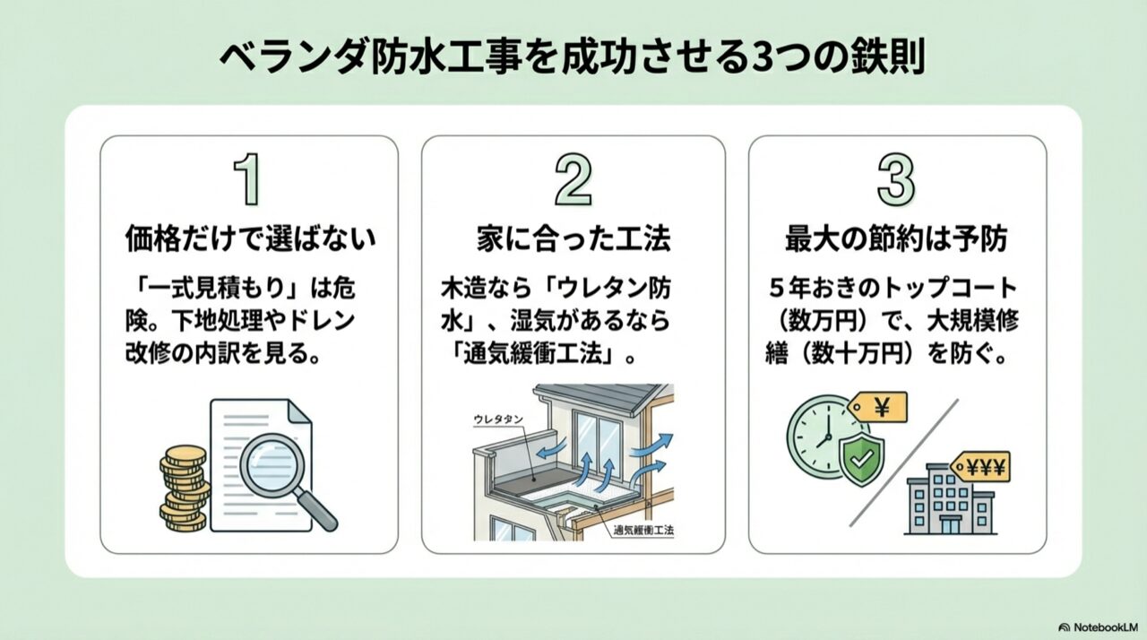 - 2.8.1. ベランダ防水工事を成功させる3つの鉄則