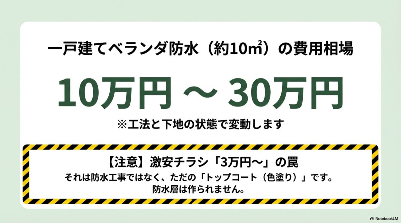 一般的な一戸建てのベランダ(約10平米・3坪程度)を想定した場合、防水工事単体の費用相場は「10万円〜30万円」が目安となります。金額に幅があるのは、採用する「工法」によって単価が異なるためです。