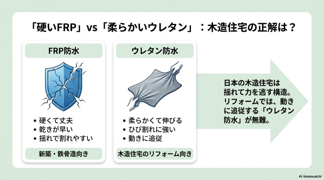 日本の木造住宅は、地震や風で「わざと揺れて力を逃す」構造になっています。そのため、硬すぎるFRP防水を後から施工すると、その動きについていけず、バリッと割れてしまうリスクがあります。