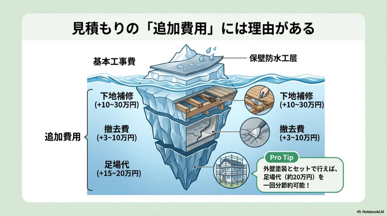 これらはあくまで「防水層を作る費用」です。ここに追加で「下地処理費」や「諸経費」、場合によっては「足場代」がかかることを覚えておいてください。