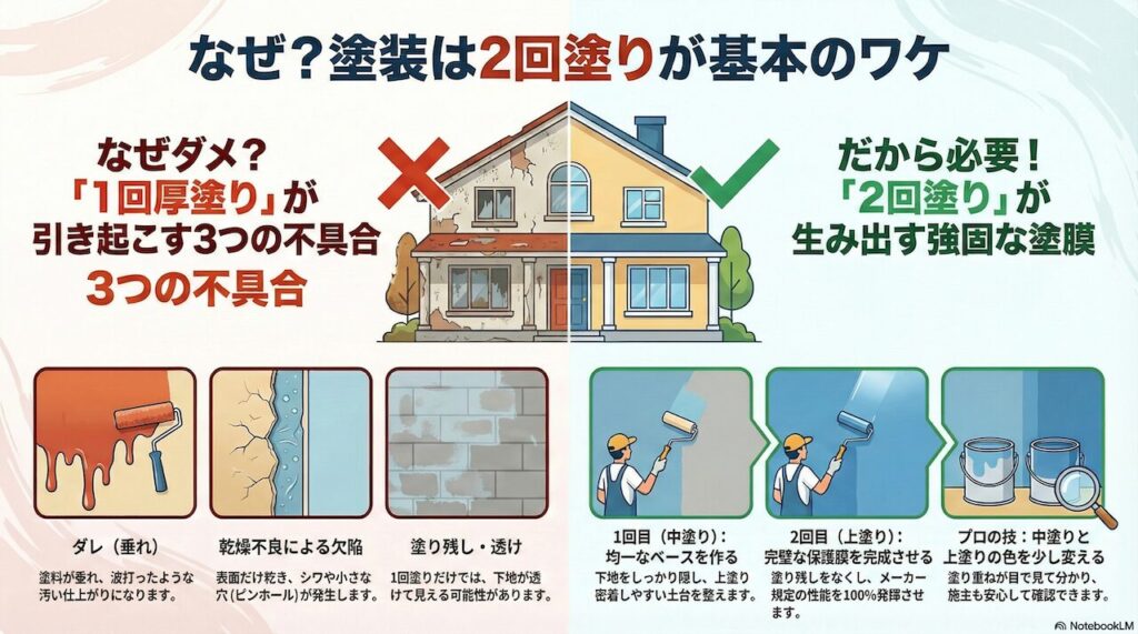 しかし、私たちプロが頑なに「2回塗り(中塗り+上塗り)」のルールを守るのには、建物を守るための明確な理由があるんです。