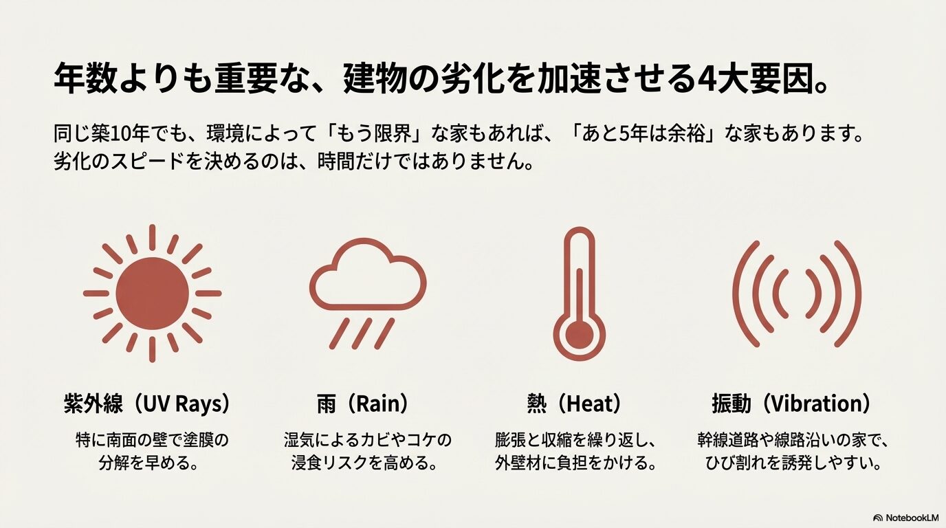 劣化のスピードを決定づけるのは、「紫外線」「雨」「熱」そして「振動」です。例えば、南面の壁は紫外線を強烈に浴び続けるため、塗膜の分解が早く進みます。