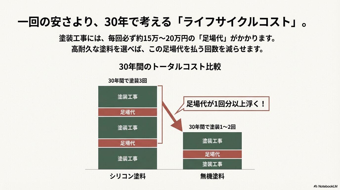 塗料選びで最も重要な視点は、一回の工事金額ではなく、「30年間でトータルいくらかかるか(ライフサイクルコスト)」です。