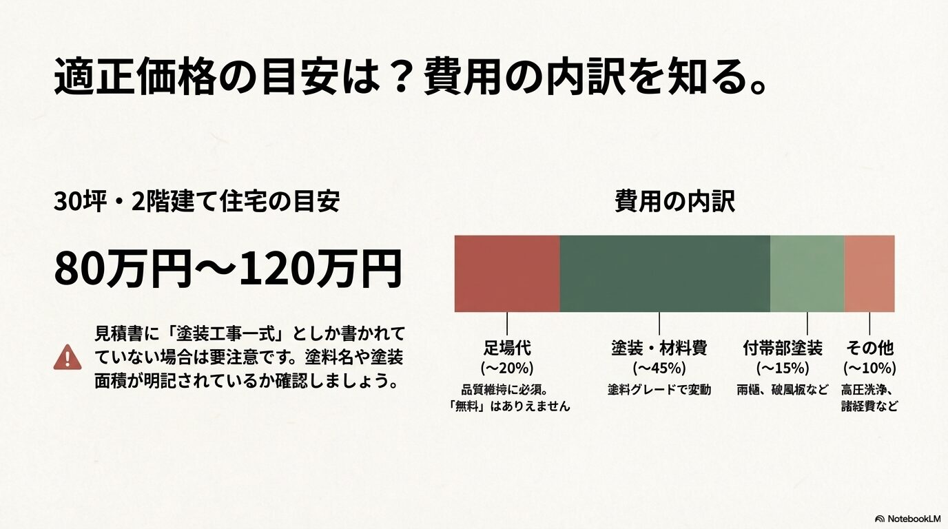 外壁塗装の費用は、「定価」が存在しないため分かりにくいものですが、ある程度の相場感を持っておくことは非常に重要です。一般的な2階建て住宅(延床面積30坪程度)の場合、80万円〜120万円程度が適正価格の目安となります。