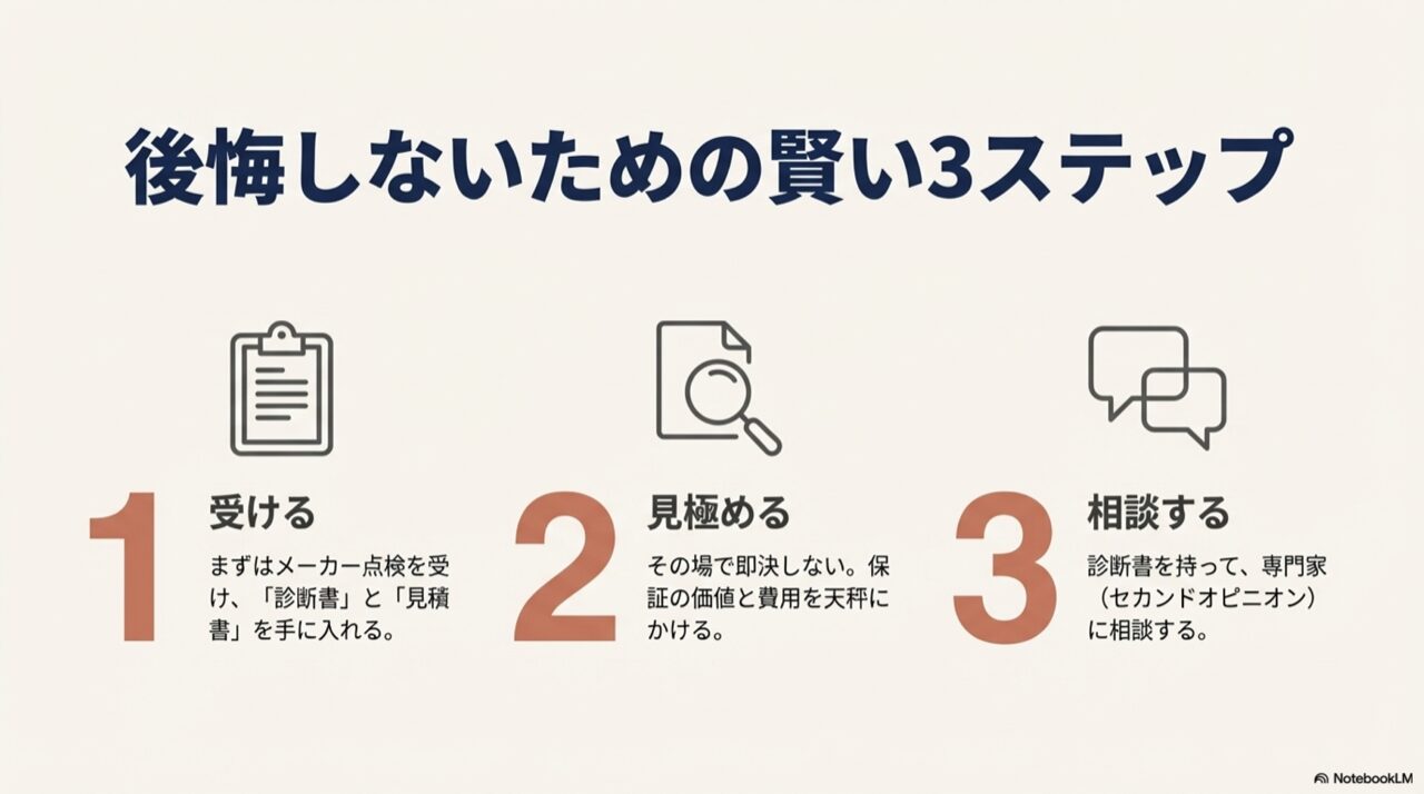 メーカーの点検を受け、詳細な「点検報告書(診断書)」と「見積書」をもらいます。これがあなたの家のカルテになります。 - 冷静に比較検討する
