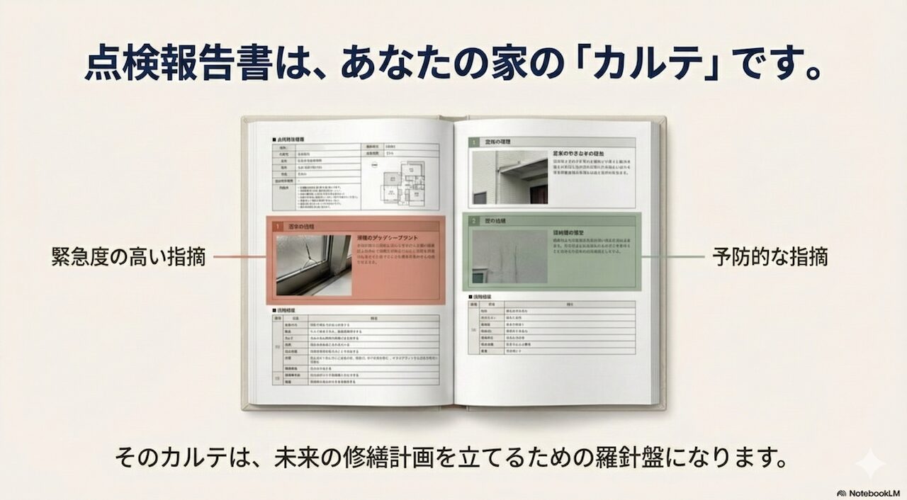「水漏れ」「シロアリ」「防水層の破断」などは待ったなしです。最優先で予算を組みましょう。 - 予防的な指摘