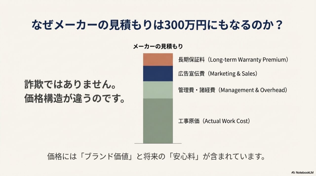 ですが、現場の人間として公平にお伝えすると、これは決して詐欺ではありません。メーカーの見積もりが高額になるのには、明確な理由と構造的な背景があります。