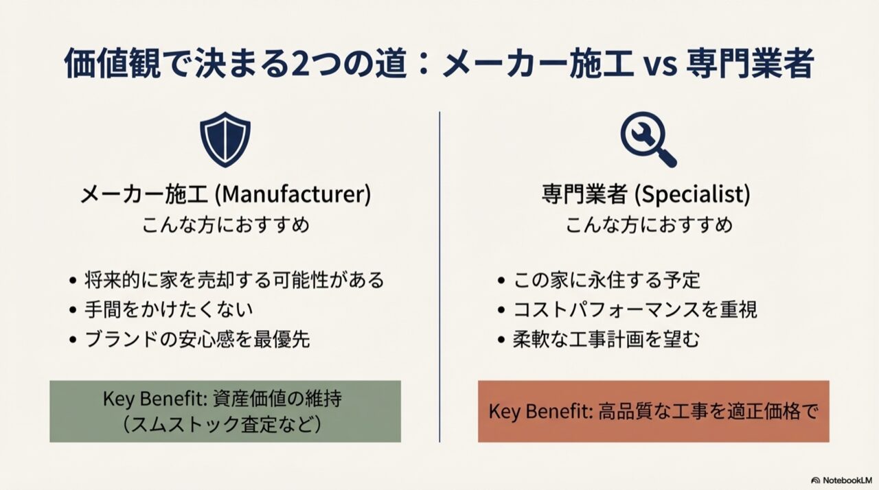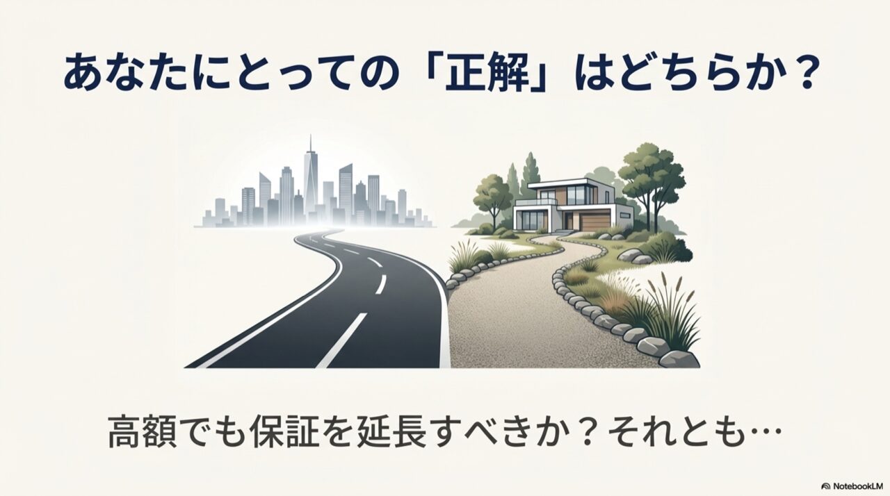 しかし、そこで支払う対価は「工事」だけでなく「保証(=安心と資産価値)」が含まれています。この判断は、お客様の「今後のライフプラン」と「価値観」によって正解が180度変わります。現場で私がアドバイスしている判断基準を詳しく解説します。