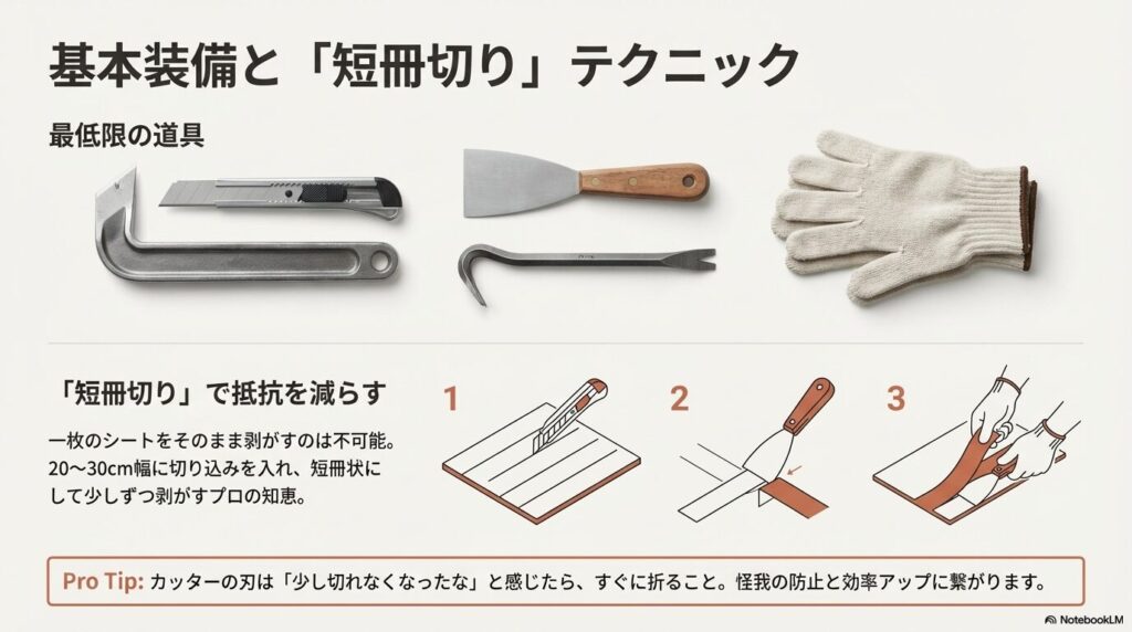 - DIYで長尺シートを剥がすための具体的な施工要領と必須道具