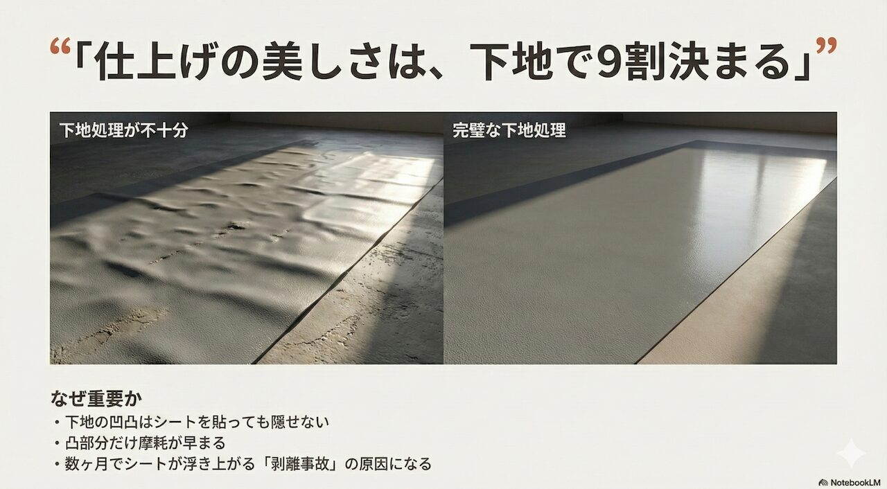 DIYで張り替えに挑戦された方が最も後悔される失敗パターンの一つが、古いシートを剥がした後の「ガタガタの糊跡」や「コンクリートの欠け」をそのままにして、新しいシートを貼ってしまうことです。