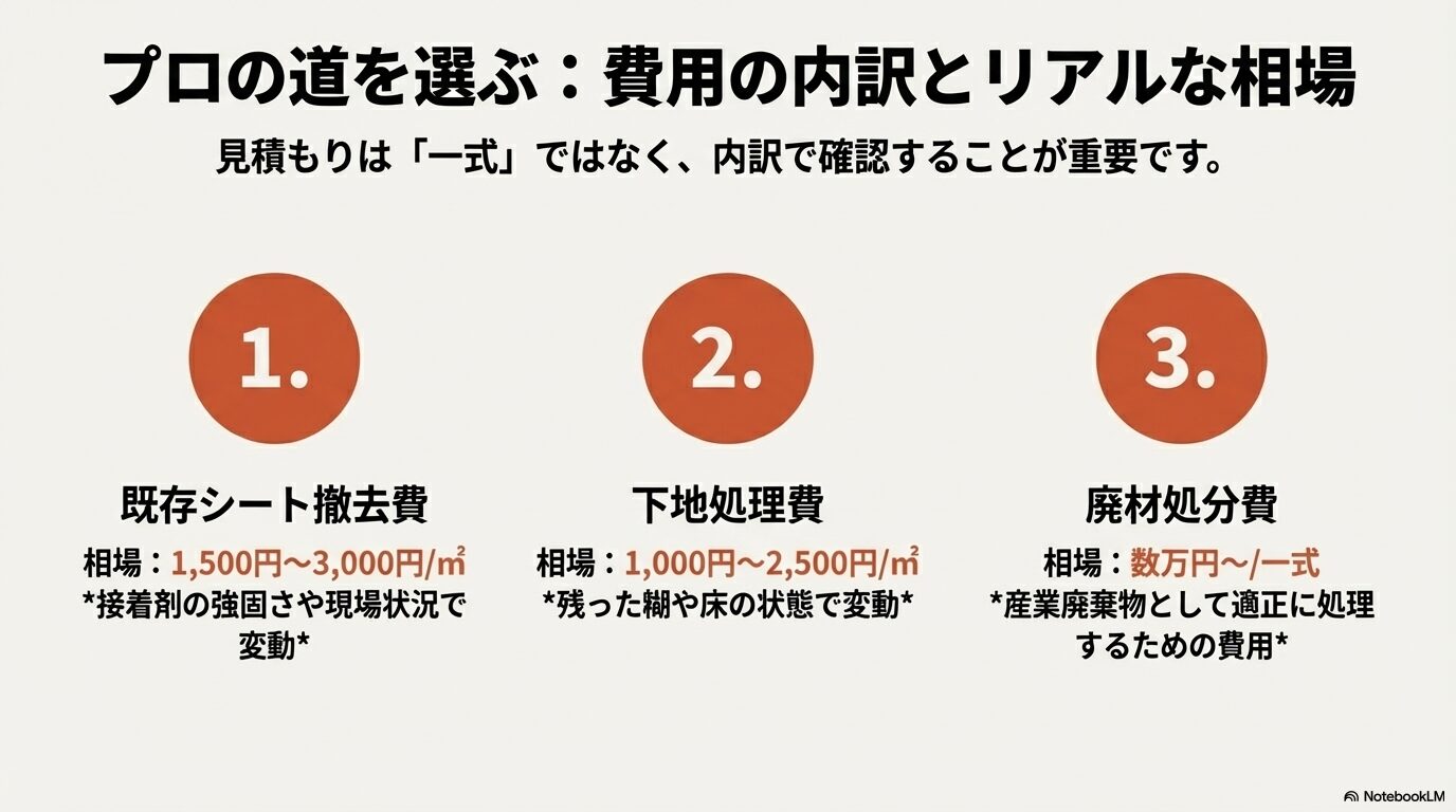 また、業者に頼むとしても、剥がし作業だけでどれくらいの料金がかかるのか、処分費や新しいシートの施工費を含めた相場はいくらなのか、不安な点も多いはずです。