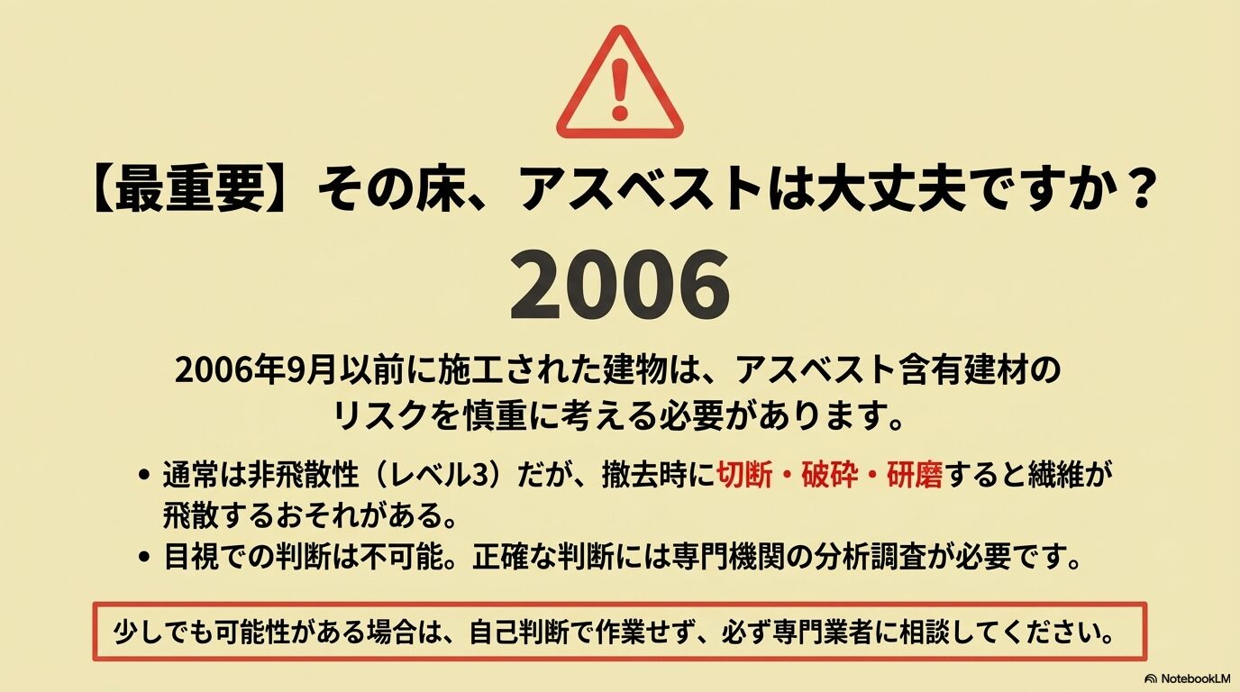 - 古い床材に潜むアスベスト(石綿)の正しい知識と安全な対処法