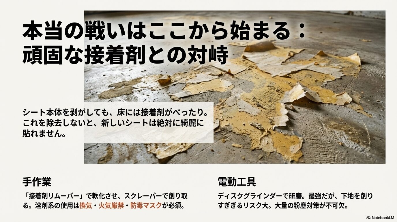 長尺シートの撤去作業は、一言で言えば「接着剤との戦い」です。