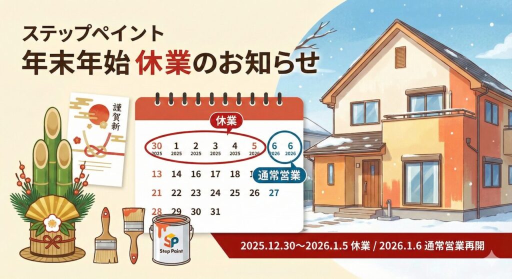 この期間中は、お電話での受付、現地調査、お見積りの作成、および現場での塗装作業をすべてお休みさせていただきます。年内の最終営業日は12月29日(月)となります。