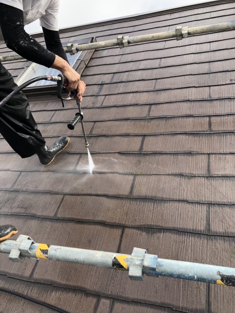塗料の性能を100%引き出すためには、正しい手順で施工することが何よりも重要です。まず、業務用の高圧洗浄機で外壁や屋根に付着した長年の汚れ、コケ、古い塗膜を徹底的に洗い流します。